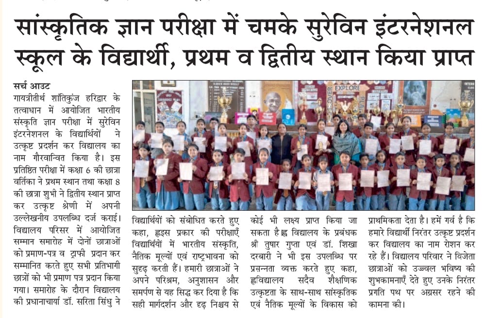 Students of Surevin International School, Niwari have achieved excellent and outstanding performance in the competition organized under the Bharatiya Sanskriti Gyan Pariksha.